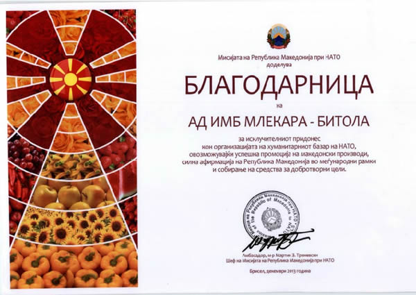 Мисијата на Република Македонија при НАТО додели благодарница на нашата Битолска млекарница за исклучителниот придонес кон организацијата на хуманитарниот базар на НАТО, овозможувајќи успешна промоција на македонски производи и афирмација на Р. Македонија во меѓународни рамки, како и собирање на средства за добротворни цели.